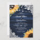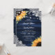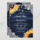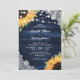 Convites de casamento florais, azuis e marinho, com flores de sol, com fundo de madeira rústico decorado com rendas florais brancas.