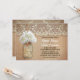 Convite de casamento rápido bonito com jarro de mason com flor branca de hydrangea. Convidado perfeito para o casamento no campo com rendas vintage e sotaques de madeira em apuros.