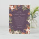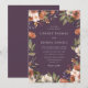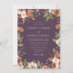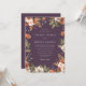 Flores e folhagens terrosas em aquarela decoram este convite de casamento de outono elegante. Este design moderno apresenta flores em tons rústicos de laranja, roxo e creme sobre um fundo roxo escuro. Um belo modelo de convite de casamento temático de outono para o seu dia especial.