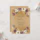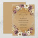Este design apresenta um fundo quente ocre adornado com um arranjo exuberante de rosas plum profundas e anêmonas brancas cremosas. Pinhas delicadas e aglomerados de bagas escuras de inverno são intercalados com raminhos de sempre-verde e folhagens bege para um ambiente aconchegante. Perfeito para um evento outonal ou de inverno, a paleta de cores evoca um senso de elegância natural e charme rústico.