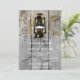 Casamento cinza rústico em madeira de celeiro com um fundo de madeira de celeiro desgastada e uma linda lanterna com uma paisagem pintada, e um jato de confetes. A parte de trás do convite é de um tom verde sage terroso, e um belo contraste.
