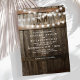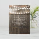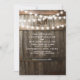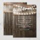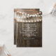 Convites de casamento rústicos com fundo de barril de carvalho escuro de celeiro rural, luzes cintilantes, seu monograma e texto de casamento moderno.