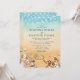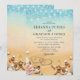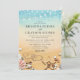 Convites de casamento de destino de praia tropical com um fundo rústico ombre amarelo para azul aquarela, estrela-do-mar, conchas, luzes de corda, dois corações na areia com suas iniciais e um modelo de casamento elegante que é fácil de personalizar.