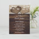 Este romântico convite de casamento de países rústicos, que inclui dois corações de burlap contra uma burlap e um fundo de madeira adornados com um rendas floral branco e luzes de cordas é perfeito para convidar seus convidados para sua festa de casamento rústica de campo/celeiro.