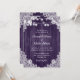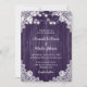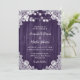 Convites de casamento rústicos roxos inspirados por rendas florais brancas e luzes de cordas em um fundo de madeira. Design de cartão perfeito para convidar seus convidados para sua festa de casamento roxa romântica.