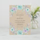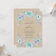Este design apresenta um fundo bege quente adornado com rosas suaves em tons de turquesa e lavanda em estilo aquarela. Folhagens delicadas e ramalhetes roxos formam arranjos florais graciosos no topo e na parte inferior do layout. Os tons terrosos criam uma atmosfera serena e rústica adequada para cerimônias ao ar livre ou em bosques. Os elementos botânicos artísticos proporcionam uma estética romântica e natural.