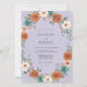 Este design apresenta um fundo suave de lavanda adornado com um arranjo de flores inspiradas no outono. Dahlias laranja queimada ricas e zinnias brancas cremosas estão aninhadas entre folhagens azul-esverdeadas suaves e raminhos delicados. A paleta combina tons pastéis frios com matizes quentes de colheita para uma estética única e romântica.