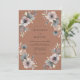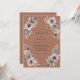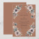 Este design apresenta um rico fundo de laranja queimada acentuado por delicados aglomerados florais em aquarela. Tons suaves de azul poeirento, lavanda e anêmonas cinza macio criam um contraste sofisticado. Folhas de eucalipto e raminhos botânicos adicionam um toque natural e terroso à estética. Ideal para um evento de outono ou tema desértico, esta obra de arte evoca um clima quente e romântico.