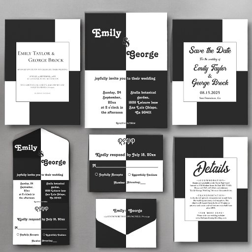 Faça uma declaração com este eterno e o convite clássico de casamento preto e branco. A tipografia em negrito e branco sobre o tema do xadrez em preto e branco cria um contraste notável e um aspecto único. Perfeito para casamentos, noivados, e outras ocasiões especiais, este convite vai causar uma impressão duradoura. O design simples, mas elegante, certamente se destacará entre os outros.