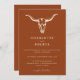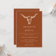 Design simples e minimalista apresenta um crânio de vaca boêmia ocidental sobre um fundo laranja deserto. Todo texto e cores são completamente editáveis. O verso do convite inclui um código QR para o seu site de casamento.