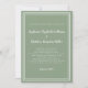 Convite de casamento elegante e moderno apresenta um design contemporâneo minimalista com uma moldura dupla em cor verde sage em um fundo branco crocante. A redação tradicional fornece sofisticação atemporal e moderna. Personalize o design do casamento com seus detalhes em letras e script verde chic. O verso do cartão combina com o verde sólido.