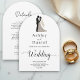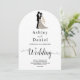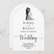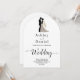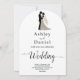 Este elegante convite de casamento de Arco Negro e Branco é perfeito para um casamento moderno. O simples design apresenta uma caligrafia preta elegante e uma ilustração noiva e noiva sobre um fundo branco limpo. O cartão de convite inclui os detalhes do casamento no verso, em vez de pagar um cartão separado.