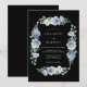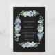 Uma impressionante estética de meia-noite define este design, tornando-o ideal para eventos noturnos formais ou núpcias de inverno. O fundo profundo de carvão cria um contraste dramático para a paleta de tons frios de azul poeirento, ardósia e creme. Rosas em aquarela, hidrangeias exuberantes e anemônias brancas são acentuadas por folhagens suaves.