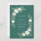 Este design apresenta um fundo verde esmeralda profundo que destaca rosas creme exuberantes e folhagens suaves de eucalipto. O arranjo botânico cria uma estética sombria, mas elegante, perfeita para um evento de inverno ou floresta inspirado na natureza. Pétalas brancas delicadas e folhas verdejantes fornecem um contraste sofisticado contra o rico fundo escuro.