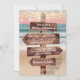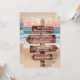 Convites de casamento romântico à beira do oceano com uma praia arenosa exuberante ao pôr do sol, luzes cintilantes e sua mensagem escrita em uma placa de madeira rústica.