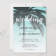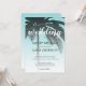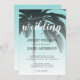 Convite de casamento de destino chic com uma palmeira tropical design num fundo azul com uma escrita elegante e tipografia moderna. O azul brilhante da casca do mar desaparece sobre um fundo branco. Basta adicionar seus detalhes de casamento a este convite de casamento de praia na moda tropical. Desenvolvido exclusivamente para você pelo Happy Dolphin studio.