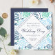 Convite para Casamento de Arte de Linha Única de Abstrato Azul Moderno Um convite único com abstrato azul e verde desenhou um padrão de arte de linha. O texto tem forma dentro a diamante. Você pode personalizar facilmente todo o texto - personalizá-lo com o nome da noiva, o nome do noivo, a data e hora, o local e alterar ou apagar qualquer texto no cartão.