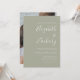 Este simples convite de casamento moderno apresenta um texto branco sobre um fundo verde sábio. Adicione os nomes da noiva e do noivo na caligrafia de escrita manual do na moda e os detalhes na fonte sans serif. Substitua facilmente a imagem de exemplo no verso por sua própria foto.