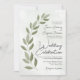 Este convite para o casamento apresenta uma design moderna com texto justificável e um tiroteio de folhas pintadas manualmente em tons de verde sábio. A inscrição apresenta uma fonte moderna e o fundo marmoreado adiciona textura e profundidade. Simples, rústico, exclusivo e chic, este convite é uma forma excelente de adicionar estilo contemporâneo à elegância clássica.