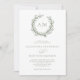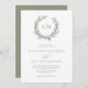 Perfeito para a praia e casamentos náuticos temáticos, uma coral enrola as iniciais do monograma da noiva e do noivo no topo desse elegante e mínimo convite branco e verde-sábio costeiro. A parte de trás é uma cor verde sólida.