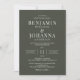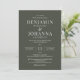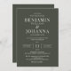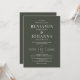 Convite de casamento clássico e elegante com fundo verde-oliva e letras brancas. Design de texto apenas com texto tradicional. Opções digitais de papel impresso ou físico. Personalize-o com os nomes do Sr. e Sra., localização do local, registro, informações de RSVP, e quaisquer detalhes que você precise incluir. Produtos de suíte correspondentes disponíveis.