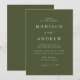 Convites de casamento minimalistas e modernos, com detalhes de casamento em letras brancas com acentos de escrita caligráfica em fundo verde-oliva. O fundo verde-oliva pode ser mudado para uma cor de sua escolha. Projetado para coordenar com a nossa coleção de casamento do Modern Elegance.
