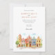 Convide seus convidados para uma celebração alegre e colorida com este convite de casamento cativo por aquarela, apresentando a vibrante arquitetura colonial de Puebla, México. O trabalho de arte exibe lindamente uma paisagem de ruas de edifícios brilhantemente coloridos, incluindo fachadas em amarelos quentes, pinks ricos, laranjas e azuis distintos, alguns adorados com padrões azulejos tradicionais do estilo Talavera (como o design diamante/harlequin). Torres de igreja características com cúpulas de terracota sobem acima da cena, todas renascendo em um estilo aquoso e vibrante. A cena é enquadrada por delicados manchas verdes de folhas e apresenta pequenos arbustos verdes e uma árvore estilizada, acrescentando um toque de charme natural. Este convite é perfeito para um casamento de destino no México, ou para casais que adoram cultura viva, arquitetura colorida e talento artístico. A frente apresenta elegantemente seus detalhes de casamento, enquanto o lado inverso oferece "Os Detalhes Mais Finos" para informações de convidado. A paleta colorida é uma mistura festiva de amarelos ensolarados, laranjas quentes, pinças vibrantes, vermelhos terracotados, vários tons de azul e verdes frescos, colocados contra um céu macio.