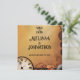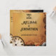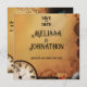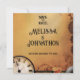 Um pano de fundo cor de laranja-castanho quente define o tom para este design de casamento steampunk, com um relógio de safra, engrenagens e arte marrom. No centro, um casal vitoriano — vestido com seu melhor traje de galinha