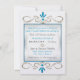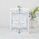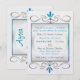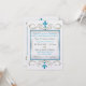 O desenho original deste Convite de Recepção Após a Cerimônia personalizado apresenta 2 miniaturas da Estrela de Davi entre floreios de dourado e turquesa em um fundo prateado. Todo o texto em turquesa ou cinza, frente e verso, é personalizável. Impresso com tintas altamente saturadas em papel metálico (gelo) de peso pesado.