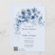Apresentando este convite de casamento encantador, com flores azuis encantadoras e encantadoras colocadas delicadamente sobre um fundo azul pálido. Este convite foi feito para evocar uma atmosfera de simples elegância e sofisticação, capturando a essência do seu dia especial. A adição do código QR permite que seus convidados acessem facilmente seu site de casamento para obter informações, inclusive informações sobre hotel, traje, detalhes de recepção e opções de janto!
