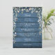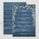 Uma cascata de verde floral lindo emoldura os detalhes da sua celebração de casamento especial definida em tipografia elegante em um fundo de madeira rústica azul. Projetado por Thisisnotme©