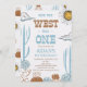 Modern Blue Brown Como o Ocidente foi um garoto convidado de aniversário como o ocidente foi um primeiro convite de aniversário com alguns cactos azuis e castanhos, flores do deserto, nuvens e sol. Este primeiro convite de aniversário do cowboy ocidental também apresenta um título de fonte no estilo ocidental.
