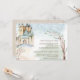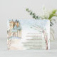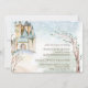 Este convite de casamento elegante e encantador apresenta um tema de conto de fadas num design de pintura a aquarela. Um castelo é fotografado à distância à esquerda, além de uma floresta encantada. A informação do casamento é colocada à direita, debaixo de um galho de arcos.
