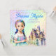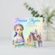 Um ajustado de convite de conto de fadas para uma princesa! Uma bela princesa com tranças pastéis e um castelo arco-íris.