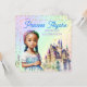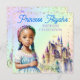 Um ajustado de convite de conto de fadas para uma princesa! Uma bela princesa com tranças pastéis e um castelo arco-íris.