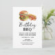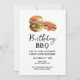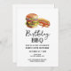 Convites de churrasco de aniversário. Fácil de personalizar. Todo o texto é ajustável e fácil de alterar para as necessidades da sua festa. Gráficos simples de hambúrguer e cachorro-quente em aquarela. Convites para ele. Design de aniversário de churrasco no quintal ou bar. Qualquer idade, basta mudar o texto.