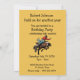 Este é um convite de dois lados com um vaqueiro montando um cavalo que se empina na frente e muitos campos de texto no verso para preencher os detalhes da sua festa. O número da idade pretende parecer uma marca na anca do cavalo.