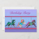 Lindo convite de aniversário roxo para meninas com cavalos de carrossel pintados de roxo, azul turquesa e rosa.