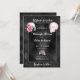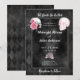 Convite de casamento sombriamente lindo com a frase Até Que a Morte Nos Separe, caveiras, mãos de esqueleto e um fundo com padrão de diamante preto. O verso do convite tem um buquê floral de rosa complementar. Perfeito para um casamento gótico ou de Halloween.