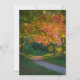 Fotografia de uma árvore de ácer vibrante em pé em uma clareira florestal. As folhas da árvore estão a passar de verde-claro a tons nojentos de vermelho, laranja e amarelo, apanhando a luz do ouro do sol da tarde. Um caminho suavemente enrolamento, coberto por folhas caídas, leva ao fundo da imagem, revestido com silhuetas desfocadas de outras árvores. A luz solar suave filtra através da cobertura, criando sombras vestidas no chão da floresta.