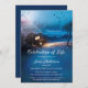 Um convite de memorial ou celebração da vida único com uma ilustração de um guia seguro para a casa do espírito, guardado por um anjo. Você pode substituir o design texturizado azul na parte de trás por uma foto personalizada, se desejar.