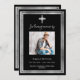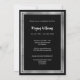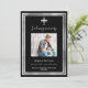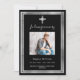 Um elegante, moderno, simples funeral/celebração de um convite à vida. Um fundo preto clássico decorado com uma cruz falsa de prata e quadros falsos de prata. Personalize e adicione um nome de foto e detalhes. Texto branco.