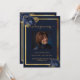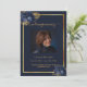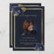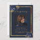 Um fundo azul marinho, uma falso estrutura dourada. Decorado com flores azuis, florais. Personalize e adicione nome, datas e texto. Adicione uma foto atrás.