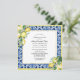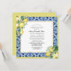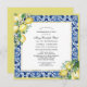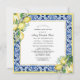 Uma elegante estrutura de azulejo azul é decorada em dois cantos com um arranjo de limão amarelo e flor branca. A borda está amarrada em amarelo Limoncello. Um quadro quadrado dourado cintilante define o dentro.