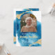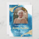 Este belo convite à Celebração da Vida azul apresenta uma Aquarela azul e um design dourado acentuado, com o seu texto em branco e uma fotografia do falecido num arco. É perfeito para um toque elegante para o serviço memorial.