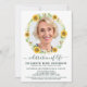 Funeral Moderno Do Memorial De Girassol/Celebração Do Convite À Vida. Estes convites de simpatia ao funeral apresentam uma foto em um girassol e design floral. Personalize esta celebração do convite para o funeral de vida com as fotos, nomes e datas de seus entes queridos, detalhes do evento. COPYRIGHT © 2021 Judy Burrows, Black Dog Art - Todos Os Direitos Reservados. Celebração Do Convite Fotográfico Floral De Girassol