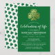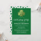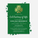 Convite de memorial de funeral irlandês elegante com fundo verde esmeralda, trevo celta em folha de ouro falso e um modelo de celebração de vida fácil de personalizar.