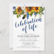 Convite de funeral boho com fundo branco que pode ser alterado para qualquer cor, uma exposição floral de girassóis rústicos, penas e um modelo de celebração da vida fácil de personalizar.