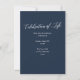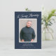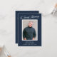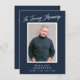 Este cartão com fotos elegante *e* Comemoração do convite Life apresenta um fundo azul escuro, uma fotografia vertical solteiro e uma tipografia simples mas elegante em branco. Na parte de trás, o fundo azul escuro se repete com texto para um convite à celebração da vida. Você pode remover o texto no verso, se desejar, basta clicar em "editar com a ferramenta design".
