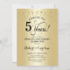 Design elegante com falso papel alumínio dourado brilhante. Possui fonte preta em script e diamantes de confete. Saúde por 5 Anos! Pode ser personalizado para mostrar qualquer ano de casamento. Me envie uma mensagem se precisar de mais personalizações.